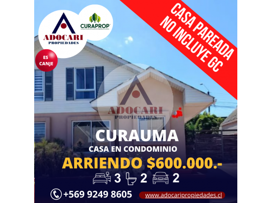 CURAUMA - ARRIENDO CASA EN CONDOMINIO - 3D 2B 2E