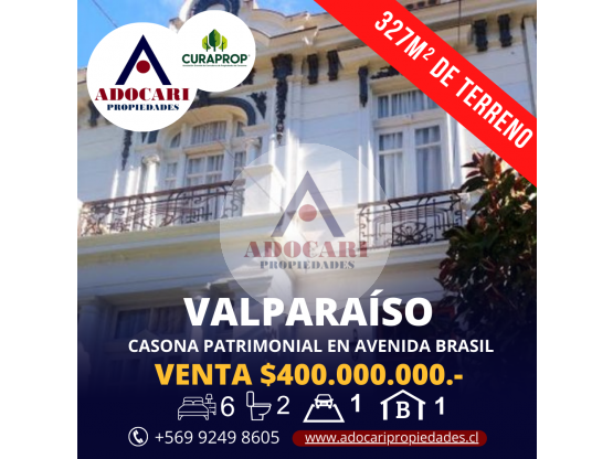 Hermosa y amplia Casona Patrimonial ubicada en pleno Plan de Valparaíso, sobre Avenida Brasil, entre calles Las Heras y Carrera, a un costado del Casino de Oficiales de Carabineros.