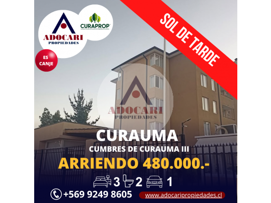 Este acogedor departamento en arriendo se encuentra en el Condominio Cumbres de Curauma III, una ubicación estratégica que combina vida de barrio, entorno familiar y áreas verdes 🌳. Ideal para quienes buscan seguridad, comodidad y cercanía a todo lo necesario.